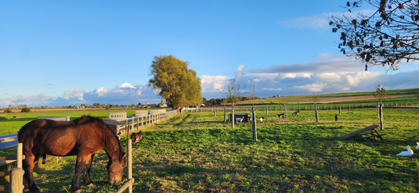 Dimanche 26 octobre 2025 : Au réveil et après le petit déjeuner, mon fils a souhaité aller voir les animaux de la ferme qui sont proches. Cheval, poules, biquettes, un régal pour lui qui aime beaucoup ces derniers.