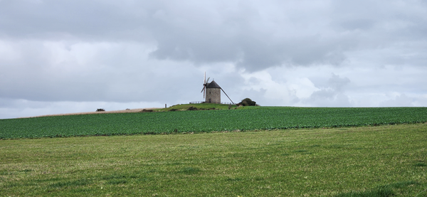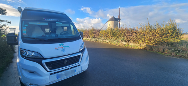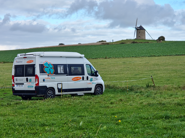 Retour au fourgon, une photo avec le moulin à vent de Moidrey en arrière plan.