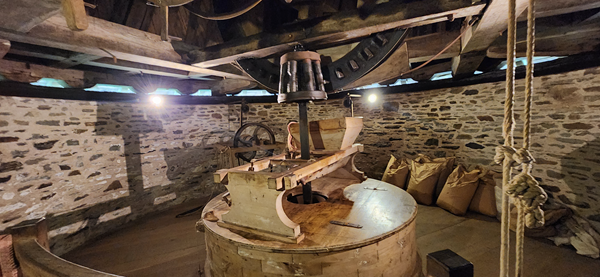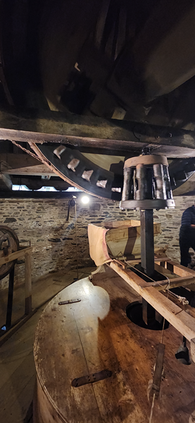 Au 1er étage, il y a un filtrage de la farine qui est pressé au 2ème par les 2 roues qui écrase les grains de blés avec plus ou moins de force. Dans le moulin à vent, on découvre plusieurs systèmes mécanique d’une simplicité folle et très facilement maintenable et réparable. Digne des meilleurs systèmes low-tech.
